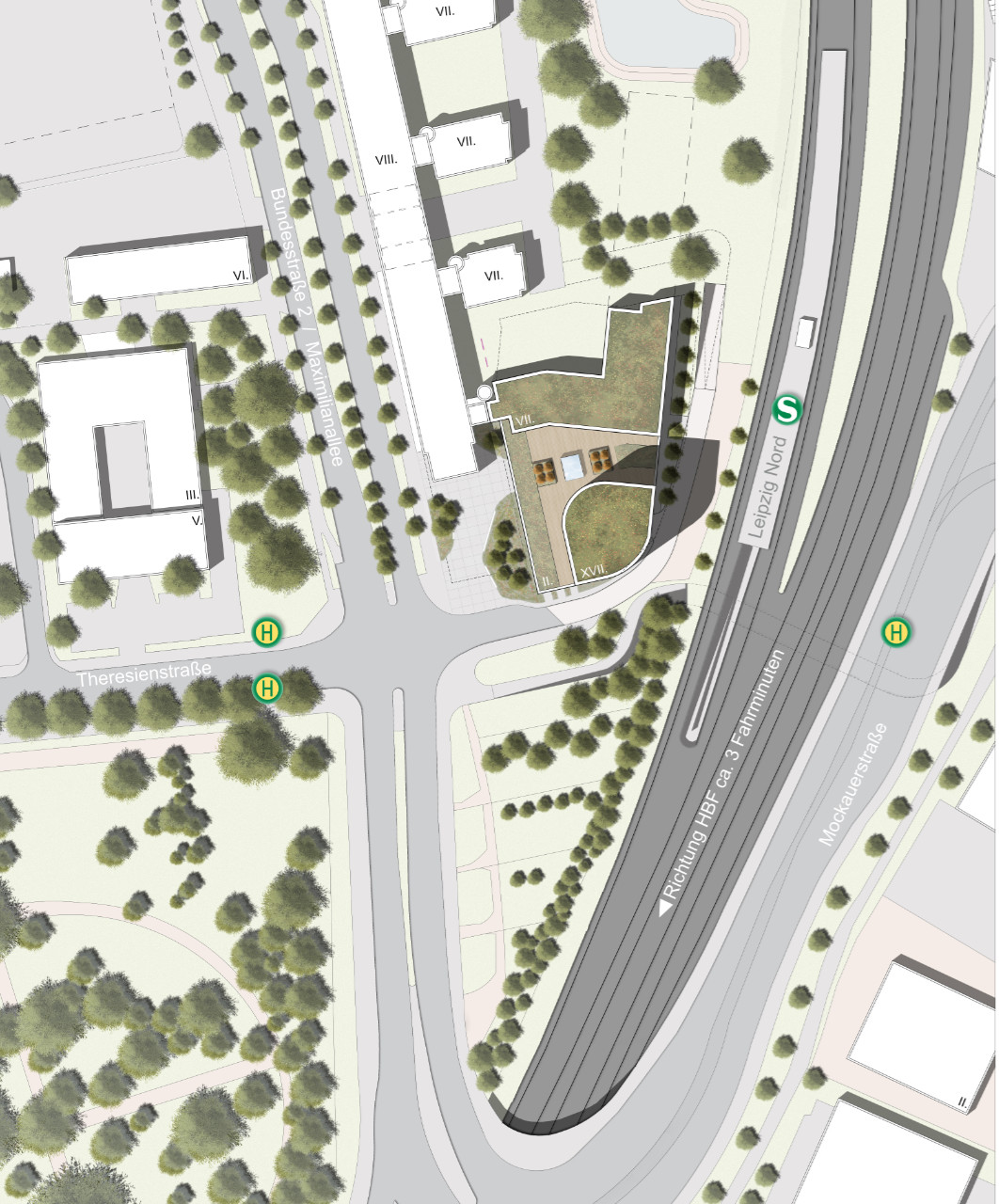 Der Entwurf von GHP sieht vor, das geplante Hochhaus baulich vom siebengeschossigen Blockrand zu separieren und lediglich über einen zweigeschossigen Sockel zu verbinden. Dadurch wird der städtebauliche „Torgedanke“ klar herausgearbeitet. Der tropfenförmige Grundriss nimmt verschiedene Baufluchten auf und erzeugt insbesondere in südlicher Richtung eine markante, dynamische Wirkung. Zugleich unterstützt diese Konfiguration die effiziente Umsetzung des Raumprogramms sowie der sicherheitstechnischen Anforderungen der VNG AG.