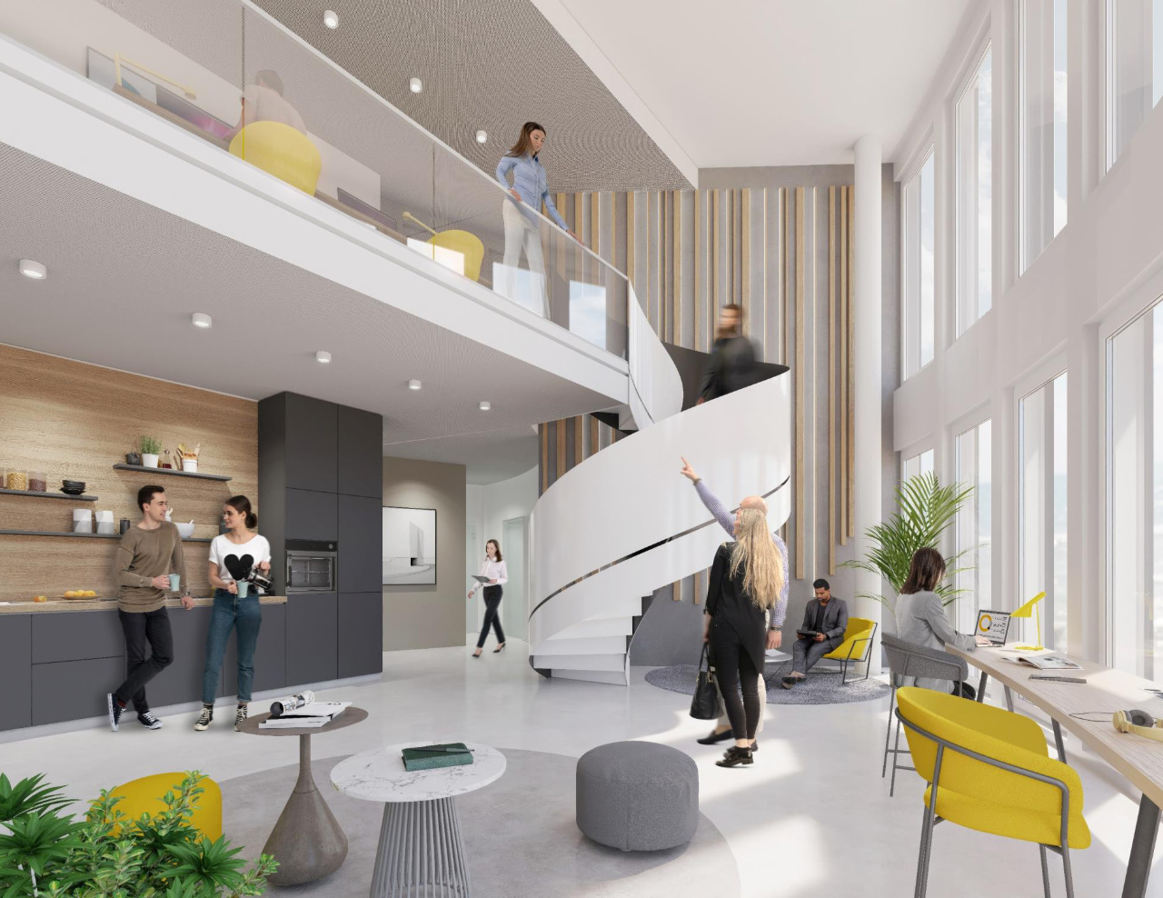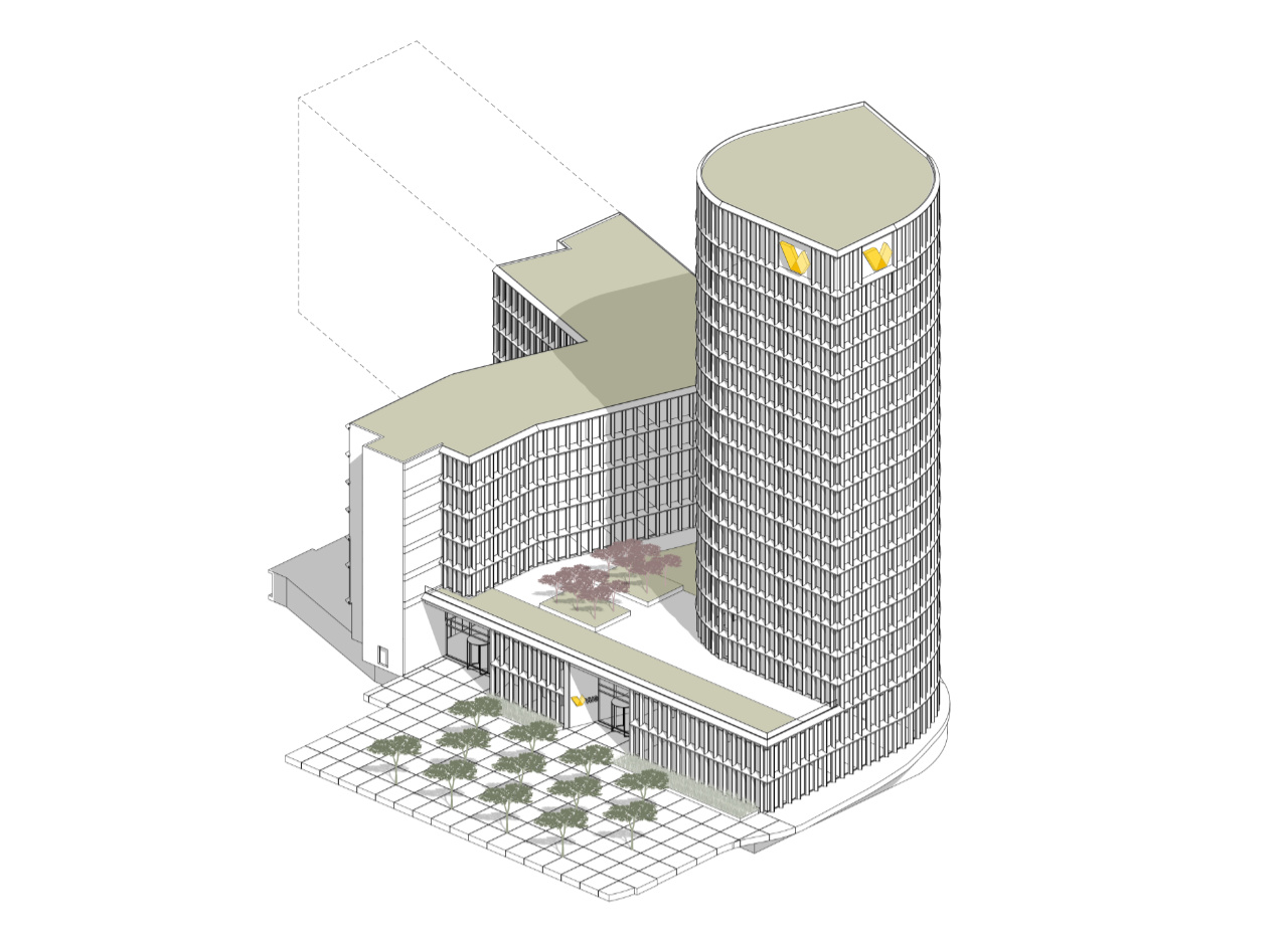 Der erweiterte Sockel definiert eine prägnante Gebäudekante zum Erschließungsplatz, der den Auftakt des geplanten Energie Campus Leipzig bildet. Von hier aus erschließen drei klar ablesbare Zugänge das Hochhaus, den Blockrand sowie das Bestandsgebäude. Öffentliche Nutzungen sind im Sockel angeordnet, während sich die Büroflächen im Turm und teilweise im Blockrand befinden.